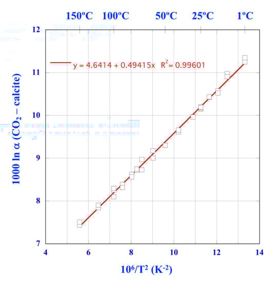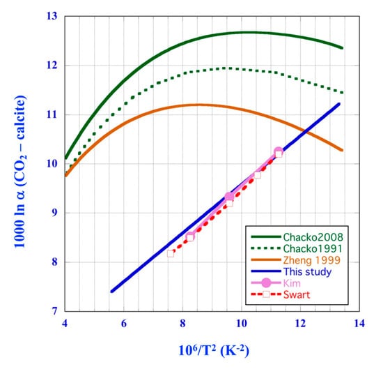 - Chacko, T.; Mayeda, T.K.; Clayton, R.N.; Goldsmith, J.R. Oxygen and carbon isotope fractionations between CO2 and calcite. Geochim. Cosmochim. Acta 1991, 55, 2867–2882. [Google Scholar] [CrossRef]