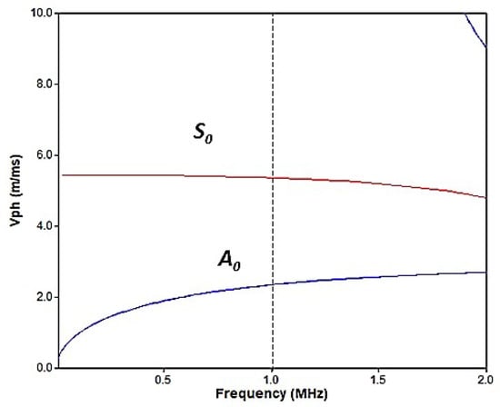 Most practical applications of Lamb waves in NDT/E and SHM utilize the fundamental symmetric and anti-symmetric modes since they can be generated at lower frequency–thickness products. Therefore, to keep the analysis simple, only the fundamental symmetric and anti-symmetric Lamb modes were considered in this study. It is well known that Lamb waves exhibit dispersion characteristics [,,], and different modes can be generated due to the fundamental relationships between the excitation frequency and thickness of the plate. As an example, a thin plate (1 mm) was chosen and the frequency of excitation was chosen such that only the fundamental symmetric () and anti-symmetric () Lamb modes can be generated, as shown in Figure 1 at 1 MHz-mm for aluminum. The material properties will be presented in the next section.
