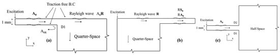 The various model geometries used for the wave propagation analysis are shown in Figure 2. Figure 2a,b shows a thin plate (thickness of 1 mm) attached to a quarter space of dimensions 0.5 m X 0.5 m, which will be referred to as the “quarter-space model” throughout this article. Figure 2c shows a thin plate attached to a half space, which will be referred to as the “half-space model”. The quarter-space model has a discontinuity , which is defined as the point where the abrupt transition in thickness occurs. The thickness transition plane in which the discontinuity occurs is termed as the discontinuity face. The half-space model has two discontinuities, and , as shown in Figure 2c. The finite element model was constrained at the bottom of the thick plate (half-space) with fixed boundary conditions, and all other faces were given traction free boundary conditions to satisfy guided wave propagation as shown in the schematic. The model was meshed using 2D, 8 node quadrilateral elements with a quadratic shape function and plane strain conditions. For convergence of a numerical solution, it is important to have at least 10 elements per wavelength of a specific mode. The present work considers the following modes with their respective velocities: m/s, m/s and m/s. The present work considers narrow-band 1 MHz excitation; therefore, the wavelengths will be mm, mm and mm. Considering the lowest mode wavelength (2.335 mm) and the highest frequency of interest (1 MHz), we require the element size to be 0.23 mm. The final element size chosen for the study such that it captures all the modes was 0.0833 mm. The number of elements near the corner of the quarter-space and half-space models was increased to model the sharp discontinuity.