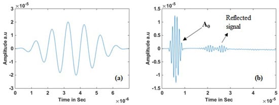 (a) The input pulse used for excitation, (b) example A-Scan showing the and reflected disturbance in the time domain.