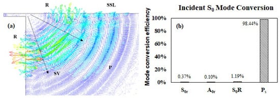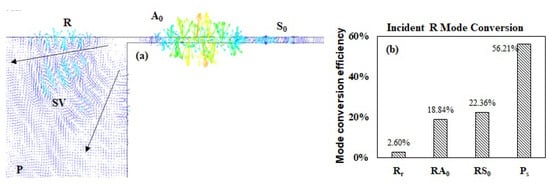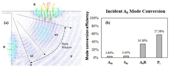 The nodal displacement vectors for the mode interaction with discontinuity are shown in Figure 5a. Unlike the case, the P waves have a higher amplitude compared to SV, and a distinct shear window (with phase reversal) is not observed. Interestingly, a sub-surface longitudinal wave can be seen propagating ahead of the R wave on the top surface. The mode conversion efficiencies calculated from the numerical model are presented in Figure 5b. About 0.37% of the incident mode is reflected in the thin plate as an mode, and less than 0.1% is reflected as an mode. The Rayleigh mode conversion efficiency for the mode was calculated to be 1.19%, which is very small compared to the mode conversion efficiency. Once again, using the power flux balance, was calculated to be 98.44%. Additionally, a sub-surface longitudinal wave was also observed, as shown in Figure 5a.