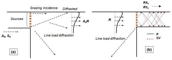 Schematic showing the hypotheses of (a) Lamb to Rayleigh mode conversions and (b) Rayleigh to Lamb mode conversion. The diffraction will be similar to a line load source with a set of Huygens’ sources. This may give rise to two hypotheses: mode conversion of Lamb to Rayleigh via grazing incidence of bulk modes on the half-space and direct diffraction of bulk modes.