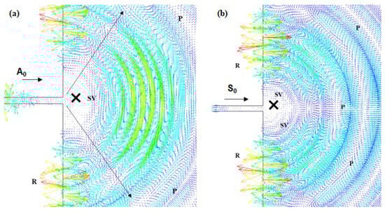 A numerical visualization of the nodal displacement vectors for the wave propagation for an incident mode is shown in Figure 4a. The mode excited in the thin plate propagates and interacts with the discontinuity , where part of the energy is reflected as and and part of it is transmitted into the quarter-space, where it mode converts into the Rayleigh mode . When the mode interacts with , it also gives rise to circular P and SV wave fronts radiating through the quarter-space, as shown in Figure 4a. Furthermore, the SV wave front amplitude is at a maximum in a “shear window”, and there is a phase reversal at the center of the window. Such a radiation pattern has been shown previously for a vertical line load acting on top of a half-space []. The power coefficients were calculated using Equation (3) and plotted in Figure 4b. The results show that >50% of the incident energy is scattered, but is converted into the R mode. The reflected energies in the plate are Lamb modes, and , the transmitted Rayleigh mode in the half-space is and the scattered modes are . Additionally, another R wave can be seen propagating along the vertical edge of the quarter space. By definition of the scattering power coefficient, this additional wave will be included in the power coefficient analysis.