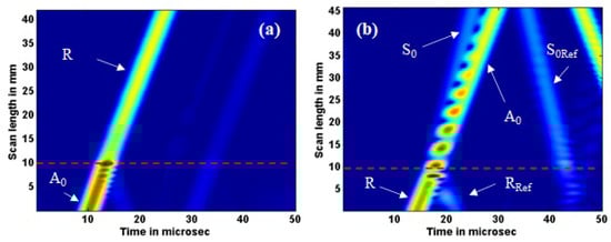 Numerical Hilbert B-Scans for (a) interaction of the mode with the discontinuity and generation and (b) incident R mode and mode conversion to and .