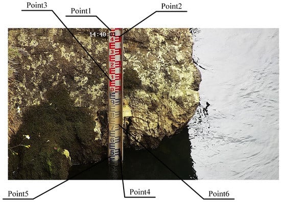 Firstly, the matching projection points are selected. The selection of matching projection points is usually arbitrary in the establishment of the perspective relationship, but according to the principles of perspective transformation, at least four pairs of matching projection points must be selected, and the projection points in each coordinate system need to satisfy that three points are not on the same horizontal line []. To further ensure the accuracy of the mapping relationship, six pairs of matching projection points are adopted in this paper. The matching projection points are: selected using the rule that they must correspond to the four internal corner points of the E character located at the four corners of the water gauge, as well as the two internal corner points of the E character at any position in the middle of the water gauge, as shown in Figure 2. Let the projection point coordinates in the pixel coordinate system be , and the projection point coordinates in the virtual water ruler coordinate system be , where .