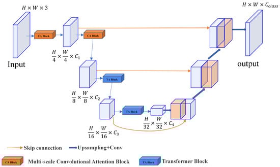 Based on the above considerations, the encoder designed in this paper adopts a hierarchical pyramid structure, with the encoder body consisting of two types of modules: the Multiscale Convolutional Attention Block and the Transformer Block. A series of SegFormer-UNet encoders are designed with reference to the original SegFormer network structure, which are named CTA-B0, CTA-B1, CTA-B2, and CTA-B3 in this paper, respectively. The dimensions of the encoder are designed by referring to the parameters of the encoder as part of the original SegFormer network structure, and customizing and optimizing them for the actual task of this paper. Table 1 shows the composition and specific parameters of each encoder building block. In the table, denotes the patch size of the overlapping patch embedding in Stage i, denotes the stride of the overlapping patch embedding in Stage i, denotes the padding size of the overlapping patch embedding in Stage i, denotes the channel number of the output of Stage i, denotes the number of encoder layers in Stage i, denotes the reduction ratio of the Efficient Self-Attention in Stage i, denotes the head number of the Efficient Self-Attention in Stage i, and denotes the expansion ratio of the feed-forward layer in Stage i. In order to make full use of the detailed features provided by the high-resolution feature map and the advanced semantic features provided by the low-resolution feature map, the encoder in this paper is divided into four stages. At the beginning of each stage, it is necessary to first obtain the features of the previous stage using Overlap Patch Embeddings layers. Specifically, suppose that the number of image features is , then the number of output features of each stage is , where . Usually, .