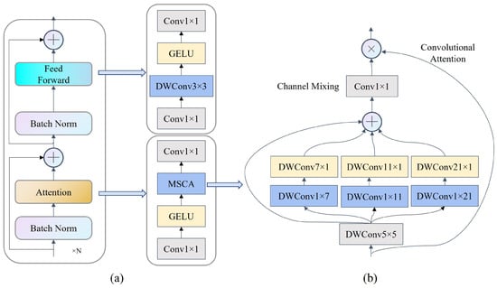 The multiscale convolutional attention block [], shown in Figure 4a, is a core module in the encoder of this paper. Its overall structure is similar to ViT, but instead of using the self-attention mechanism, a multiscale convolutional attention block is redesigned using convolution, as shown in Figure 4b. The multiscale convolutional attention block consists of three parts: a deep convolution for aggregating local information, a multibranch convolution for capturing multiscale contexts, and a convolution for mixing different channel relationships. Mathematically, the multiscale convolutional attention module can be written as Equation (3).