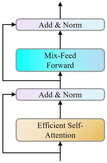 Another important module used in this encoder is the existing Transformer block in the original SegFormer, as shown in Figure 5. The core difference between this building block and the traditional Transformer block is the replacement of the multi-headed attention. The efficient self-attentive layer proposed in the original paper is able to reduce the computational complexity, which is implemented by compressing the sequence length using the scaling reduction mentioned in PVT [], i.e.