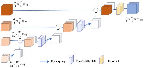 The decoder structure in the original SegFormer model simply performs upsampling and linear variation on the four different resolutions of the feature maps obtained from the encoder output, and then feeds them into multiple fully connected layers to obtain the final result. Although this lightweight decoder structure avoids excessive computation, the direct and aggressive upsampling of the encoder output may lead to the loss of detailed information, especially in the positioning of the water level line as addressed in this paper. To fully leverage the semantic and spatial information in the feature maps at different stages of the encoder output, this paper proposes a new decoder that references the encoder structure in the UNet network. The structure is illustrated in Figure 6. The decoder employs a skip-connection architecture to make full use of the semantic and spatial information contained in the feature maps at each stage. Meanwhile, the stepwise upsampling technique used in the skip-connection process enables the decoder to capture the relevant features that were lost in the downsampling process of the encoder.