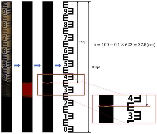 where h is the water level value, n is the total number of pixel points, is the vertical coordinate value of the i-th point, and k and b are the linear variation scale and offset coefficients, the values of which depend on the precise size of the water gauge in the virtual gauge space chosen. Because the length of a single standard scale in virtual space is 1000 pixels, k and b in this work are and 100, respectively. Considering the real-world scenario where two water gauges are joined together vertically, the virtual space water gauge needs to be adjusted accordingly: in this case, as the total length of the virtual space water gauge has been adjusted to 2000 pixels, and the values of k and b in Equation (5) should be set to and 200, respectively. After the water level line is converted to the virtual water gauge, assuming its vertical coordinate in the virtual water gauge is v, the water level value can be easily calculated based on v, as shown in Figure 8.