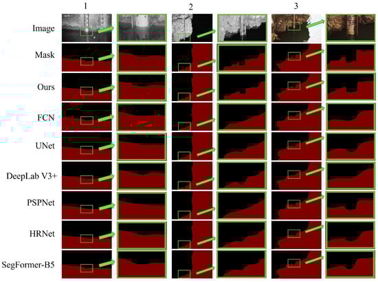 To verify the rationality of the encoder design in this paper, we conducted tests and analyzed the degree to which model performance is affected by different encoder sizes. The specific test results are shown in Table 3. From the model’s performance on the test set, we found that the model’s performance improved with increasing encoder size. The largest model of our design, SegFormer-UNet-B3, already outperforms the original SegFormer-B5 model with only half of the parameters and computational effort. This indicates that the encoder design in this paper is reasonable to a great extent.