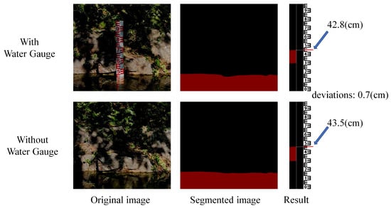 In Table 5, it is evident that the average absolute pixel error for water level line detection in this paper is significantly lower than those of other water level detection algorithms. This is due to two reasons. Firstly, the water gauge images used in this paper are actual site images, which include a small number of night images and missing water gauge features. Secondly, the proposed algorithm in this paper does not rely on the water gauge itself after establishing the mapping relationship, which substantially eliminates the negative impact caused by missing water gauge features. In contrast, other water level detection algorithms such as [] detect the water level line position directly by detecting the lower edge of the water gauge, and [] uses DeepLabv3+ to directly segment the water gauge, which has a greater accuracy than detecting the lower edge of the water gauge position. The study in [] uses color information to segment the water level, rendering the algorithm ineffective during the night. The study in [] can be considered as an improvement on [], as it crops a small area of the water gauge close to the water surface and then segments the small area to obtain the water level line position. These algorithms rely to some extent on the body characteristics of the water gauge itself, which impact on the accuracy and reliability of the algorithm.