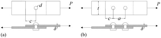 In Equation (13), Ab represents the cross-sectional area of the rivet, Gb is the shear modulus of the rivet, Er is the modulus of elasticity of the rivet, Eb is the modulus of elasticity of the plate, and β is the coefficient of secondary bending. Since only the load bearing of the tensile load in the horizontal direction was analyzed during this study, β = 0 was applied.