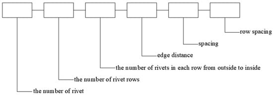 The rivet arrangement labeling format is shown in Figure 3. As an example, for specimen 5-3-122-8-12-10, the “5” indicates that there are five rivets, the “3” means that there are three rows of rivets, the”122” shows that, from left to right, the three rows of rivets contained one, two, and two rivets, the “8” denotes the edge distance, the “12” represents the rivet spacing, and the “10” denotes the row spacing. The unit of edge distance, rivet spacing, and row spacing is mm.