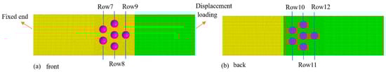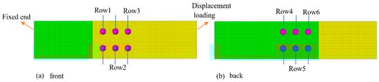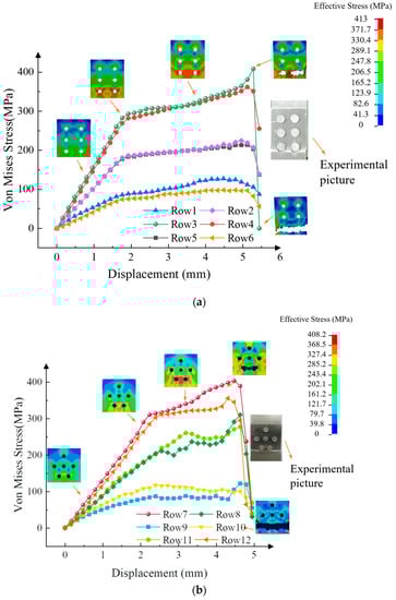 Stress analyses were performed for the single-lap joints labeled 6-3-231-8-10-10 and 6-3-222-10-16-10. The positions of rows 1 through 12 were defined, and their finite element models are shown in Figure 8 and Figure 9. Figure 8a shows the front view of the “222” arrangement, with rows 1 through 3 defining the three rows of rivets in the upper plate. Figure 8b shows the back view of the “222” arrangement, with rows 4 through 6 defining the three rows of rivets in the lower plate. Figure 9 is constructed similarly to Figure 8. The displacement–stress curves of the units around rows 1 through 12 are shown in Figure 10, where (a) shows the displacement–stress curve for each rivet in the “222” arrangement and (b) shows the displacement–stress curve for each rivet in the “231” arrangement. In this simulation process, the failure determination criteria were obtained by the fitting method based on the previous single-riveting LS-OPT in Chapter 2.2.1. The stress values were usually taken as the average stress of the element between the row 1 rivet and row 2 rivet, where the von Mises model was used to describe the stress. The simulated fracture location is consistent with the location from the test results. Figure 10a shows that the stress in row 3 was greater than the stresses in rows 1 and 2, and the stress in row 4 was greater than the stresses in rows 5 and 6. For the front and back of the specimen, the stress in the outer row (either the row closer to the load end or the fixed end) was always greater than the stress in the inner row. The stress increased with the proximity to the outer row. The stress in row 3 was greater than the stress in row 4, causing a fracture to occur at the load end. Figure 10b shows that the stress in row 7 was greater than the stresses in rows 8 and 9, and the stress in row 12 was greater than the stresses in rows 10 and 11. The stress in the outer row was always greater than the stress in the inner row. The stress in row 7 was greater than the stress in row 12, thus causing a fracture to occur at the fixed end. The simulation results show that when there was an equal number of rivets in each row, the stresses in the outer rows of both the upper and lower plates were always greater than the stresses in the inner rows. Since the load was first transferred to the rivets at the load end, resulting in greater stress at the load end than at the fixed end, fractures occurred at the outside of the load end. When there were different numbers of rivets in each row, the outer row—which had more rivets—fractured first because the stress there was greater than at other locations. The cloud diagram shows that, as the load increased, the stress in the outer row increased first and yielded. The stress concentration area then expanded to form an “M”-type stress concentration area around the rivet, and the stress was greatest between the two rivets. When the principal strain reached the failure strain, a fracture occurred, first between the two rivets, then extended outward until the entire fracture had been completed.