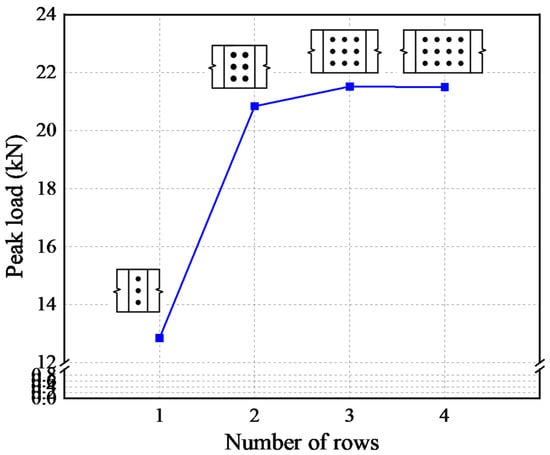 Tests were performed for specimens with an edge distance of 8 mm, a rivet spacing of 10 mm, a row spacing of 10 mm, plate dimensions of 130 mm × 36 mm × 2 mm, and from one to four rivet rows. The effect of the number of rivet rows on the peak load is shown in Figure 12. The results show that when there was a single row of rivets, shear damage occurred in the rivet; however, when there was more than one rivet row, fracture occurred in the plate. When the total rivet strength was greater than the remaining strength of the plate, increasing the number of rivet rows did not significantly increase the lap strength. The specimen with three rows of rivets had the greatest lap strength, but its peak load was only 0.68 kN larger than that of the specimen with two rows of rivets. There was no improvement in the lap strength when there were four rivet rows than when there were three. From the lap length analysis perspective, increasing the lap length did not significantly increase the lap strength. Therefore, when the total rivet strength is greater than the remaining strength of the plate, the number of rivet rows is not critical to the lap strength. Improving the strength of a lap joint requires changing the rivet arrangement.