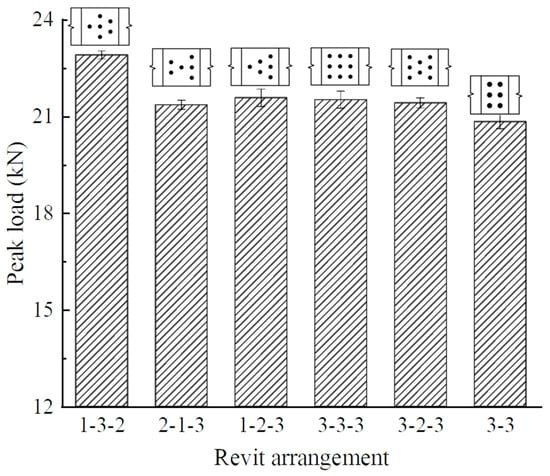 Tests were conducted for specimens with an edge distance of 8 mm, a rivet spacing of 10 mm, a row spacing of 10 mm, plate dimensions of 130 mm × 36 mm × 2 mm, and different rivet arrangements. The results show that plate fractures occurred in all the specimens. The effect of the rivet arrangement on the peak load is shown in Figure 13. A comparison of the 1-3-2, 2-1-3, and 1-2-3 arrangements shows that when the total number of rivets was the same between specimens, and there were more than two rows, the specimen with more rivets in the middle row had a higher static strength. This result primarily occurred because when there were many outer rivets and few middle rivets, the stress concentrations around the outer rivets were superimposed, causing larger stress concentrations and a smaller static strength in the member. A comparison of the 1-3-2 and 3-3-3 arrangements shows that the number of rivets was inversely proportional to the peak load when the lap areas were equal; therefore, an increase in the number of rivets does not necessarily increase the lap strength. Multiple rows of rivets should be arranged with more rivets in the middle and fewer on the sides. A comparison of the 3-3-3 and 3-2-3 arrangements shows that there was no significant difference between the static strengths of the staggered and parallel arrangements.
