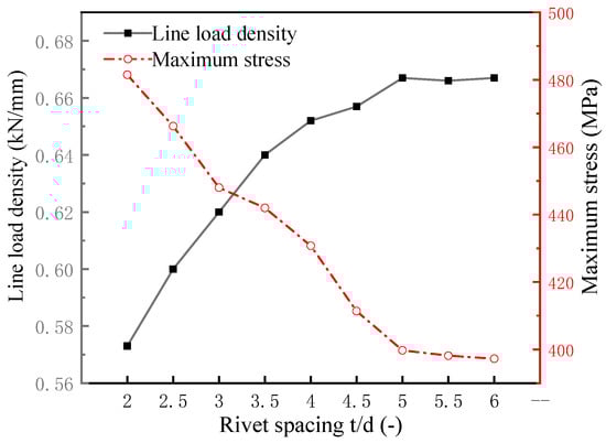 To eliminate the effect of the plate width on the lap strength, the lap strengths of the specimens were measured using the line load density, F/W. Tests were performed for specimen 8-4-2222-8-t-10 using different riveting spacings, where t = 2d, 2.5d, 3d, 3.5d, 4d, 4.5d, 5d, 5.5d, and 6d. The plate had dimensions of 130 mm × W mm × 2 mm, where W = 24, 26, 28, 30, 32, 34, 36, 38, and 40. The effects of the rivet spacing on the line load density and the maximum stress are shown in Figure 15. The results show that the line load density increased with increases in the rivet spacing. However, when the rivet spacing was greater than 5d, the line load density did not change significantly with further increases in the rivet spacing. Therefore, the maximum stress decreases as the rivet spacing increases and the degree of reduction decreases when t > 5d.