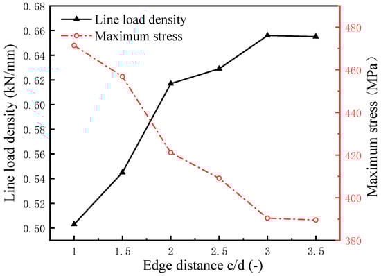 Tests were performed for specimen 8-4-2222-c-12-10 using different edge distances, where c = d, 1.5d, 2d, 2.5d, 3d, and 3.5d. The plate had dimensions of 130 mm × W1 mm × 2 mm, where W1 = 20, 24, 28, 32, 36, and 40. The effects of the edge distance on the line load density and the maximum stress are shown in Figure 16. The results show that the line load density increased with increases in the edge distance; however, when the edge distance was greater than 3d, there was no significant change in the line load density with further increases in the edge distance. Therefore, the maximum stress decreases as the rivet edge distance increases and the degree of reduction decreases when c > 3d.