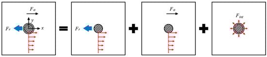 While symmetry is present in single-riveted structures, multi-riveted structures are antisymmetric because each rivet hole is subjected to a different load. The proportion of the load applied to each specific rivet hole is closely related to the material properties, the number of rivets, and the lap joint format. The rivets can be divided into three categories according to the forces applied at different locations: first rivet, end rivet, and middle rivet. The first rivet is closest to the external load and is subject to the rivet transfer load, the bypass load, and the interference force. The end rivet is furthest from the external load and is subject only to the rivet transfer load. A middle rivet is located between the first and end rivets and is simultaneously subject to the rivet transfer load, the bypass load, and the interference force. In addition, the farther away a middle rivet is from the first rivet, the smaller the bypass load and interference force. After the rivet transfer load is applied to the rivet–hole structure, it releases the interference strain due to peri-hole interference extrusion deformation, then extrusion of the rivet hole occurs. The bypass load can be considered stretching with an orifice plate. The force on the rivet hole can be considered a superposition of the rivet transfer load, Fr, the bypass load, Fa, and the interference force, Fint, as shown in Figure 17.
