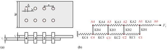 During a load analysis of a lap joint, the spring–mass model can be used to fit the load transfer process when the member is loaded, as shown in Figure 19. In Figure 19a shows the simplified model, in which W is the plate width, a is the row spacing, r is the rivet radius, t1 and t2 are the thicknesses of the upper and lower plates, respectively, and Figure 19b depicts the spring–mass model, where KA and KC represent the spring stiffnesses of the upper and lower plates, respectively, and KB is the spring stiffness of the rivet.