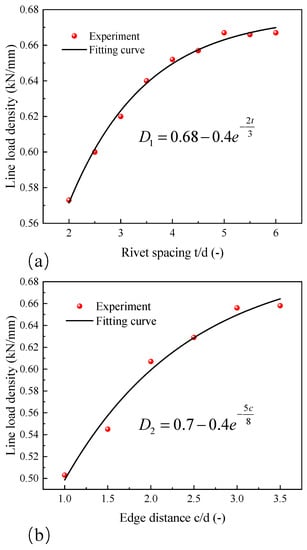 Figure 21 shows the fitting curves for the line load density, where (a) depicts the curve for the line load density as a function of the rivet spacing and (b) depicts the curve for the line load density as a function of the edge distance. The fitting results shown in Figure 21a,b produced Equations (16) and (17), respectively.