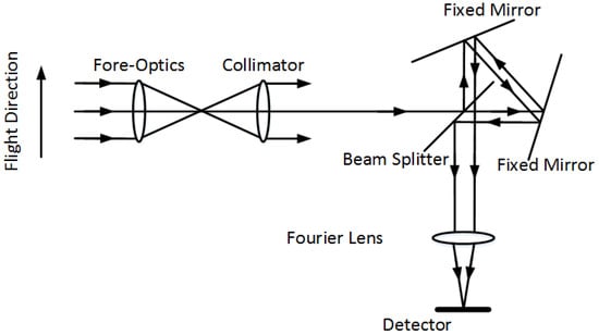 Ongoing interest within the realm of remote sensing applications has led to the dramatic development of hyperspectral sensors, which possess high spatial and spectral resolution, having hundreds or thousands of bands. In particular, the stationary imaging Fourier transform spectrometer (SIFTS) has been given considerable attention because it does not employ any moving parts [], and much effort has been invested in its development for use in airborne and spaceborne missions, such as the spatially modulated imaging Fourier transform spectrometer (SMIFTS), the Fourier transform visible hyperspectral imager (FTVHSI), the Fourier transform hyperspectral imager (FTHSI), the digital array scanned interferometer (DASI), the high-efficiency hyperspectral imager (HEHSI), and the hyperspectral imaging system SYSIPHE []. However, traditional SIFTSs all have a slit that greatly reduces the utilization of energy []. The large aperture static imaging spectrometer (LASIS) is a temporally–spatially modulated imaging interferometer that was developed in the late 1990s [,]. Because the slit is eliminated in the optical system of the LASIS, it has a much higher throughput than conventional SIFTSs. Additionally, this system offers benefits such as a high luminous flux, spectral linearity, a lightweight structure, and a broad spectral range while effectively resolving the challenge of maintaining high optical flux and stability. In recent years, several interferometers that use LASIS-like principles have been proposed, such as the aerospace leap-frog imaging static interferometer for earth observation (ALISEO) [], the long wavelength infrared (LWIR) hyperspectral imager [], and the large-aperture spatial heterodyne imaging spectrometer (LASHIS) [,,].