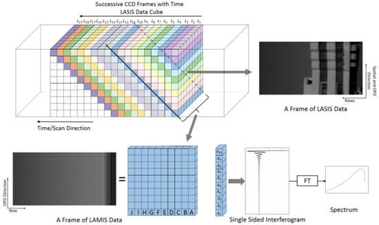 In the pushbroom scanning approach of the LASIS sensor, each row of the CCD detector successively observes the same points in object space. The regrouping of the same row of each frame of the LASIS data cube allows us to obtain a complete scene of the full field of view under the same optical path difference (OPD) as illustrated in Figure 4. By scanning through all the OPD positions, we can obtain a data cube that represents the response of the same field of view under all OPD bands. Since this data cube is similar to the form of data acquired by temporally modulated Fourier transform imaging spectrometers, i.e., dynamic interference imaging spectrometers, we denote this cube as a LADIS (Large-Aperture Dynamic Imaging Spectrometer). The extraction of the LADIS is a generalized coordinate transformation from the photo-acquisition space, , to the OPD-image space, , as illustrated in Figure 5. The matrix formula for this generalized coordinate transformation can be written as