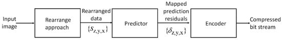 Due to the unique properties of the LASIS, we divide the lossless compression of LASIS images into three steps: data rearrangement, prediction, and encoding. The three functional stages of this compression scheme are provided in Figure 3.