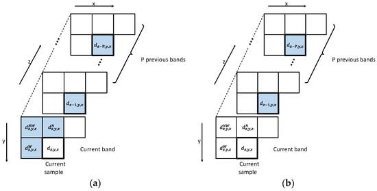 The predictor’s task is to calculate the set of predicted sample values, , and mapped prediction residuals, , from the input image samples, , where x and y are the coordinates of the spatial dimensions, and the z index refers to the OPD band of the rearranged LADIS data. The prediction at sample is based on a set of previously sampled values, which include both the current band and previous bands.