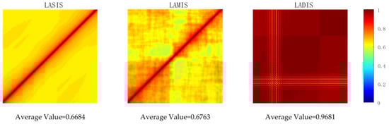 The first experiment examines the impact of the data rearrange method introduced in Section 3.1 on the compression performance. The inter-frame correlation coefficients for the LASIS, LAMIS, and LADIS data cubes are calculated using Equation (3), where is the number of rows, is the number of columns in each frame, and and are the mean values of the and frames, respectively.