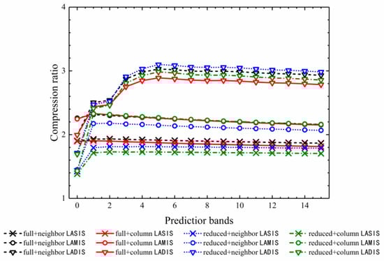 Figure 9a illustrates the relationship between the compression ratio and the number of prediction bands, , showcasing the effect of different options for the prediction mode and local sum type. The figure indicates that utilizing the reduced prediction mode in conjunction with the neighbor-oriented local sum type yields the best performance. Not using any prediction band (i.e., ) results in the worst performance, as expected. The compression ratio increases along with the increment of because the adjacent OPD bands have relatively few detail changes and strong inter-frame correlations, leading to good prediction performance. However, when the number of bands used for prediction reaches a certain value, the inter-band correlation decreases, and the improvement in prediction performance becomes less significant or even results in a decrease in prediction accuracy due to the marginal diminishing effect. We can see that the compression ratio curve tends to flatten or even decrease when the number of prediction bands is larger than five.