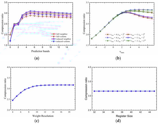 Compression ratio for different predictor parameters: (a) number of prediction bands, compression mode, and local sum type; (b) weight update scaling exponent final value, weight update scaling exponent initial value, and weight update scaling exponent change interval; (c) weight resolution; (d) register size.
