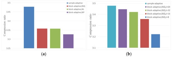 The compression ratio under block-adaptive entropy coding when the BSQ, BIL, and BIP encoding orders are used along with the sample-adaptive compression performance are presented in Figure 11a. The value of the block size used in this experiment is 16. The BSQ appears to perform slightly better than the BIL, and the BIP encoding order typically performs much more poorly than the other two. The BIP encoding order mixes samples from different bands within the same block. Therefore, the similarity of the data within a block is not as high as that of the first two encoding methods. Furthermore, when the width of an image is a multiple of the block size, , the blocks generated by the BIL and BSQ encoding orders are the same, but the ordering of these blocks within the image is different. Compared with the BIL encoding order, the BSQ encoding order makes it easier for zero blocks to be adjacent, resulting in a slightly higher compression ratio. In general, sample-adaptive coding presents better performance than the block-adaptive approach by a considerable degree. The advantages of block-adaptive entropy coding can only be observed when there is a significant presence of zero blocks within the mapped prediction residuals.
