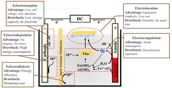 Sources of HMs can be natural such as landslides, weathering, and volcanic eruptions, but they mainly originate from anthropogenic processes such as mining, agriculture, electroplating fossil fuel combustion, and waste disposal. For instance, agricultural use of HMs in the form of pesticides and fertilizer as well as corrosion and industrialization releases HMs into the environment [,]. Untreated wastewater containing heavy metals discharged into the natural environment can pollute water bodies and soil, endangering food safety and human health through the food chain []. An increase in concern for public health has led to the enaction of varied legislation to control the emission of HMs []. This increase in public health concern has led to the enaction of varied HM emissions control legislation. This leads to an eruption of interest in developing new technologies to control emissions. Widely applied technologies for HM removal are based on solid-phase extraction using precipitation, coagulation, and flocculation []. However, a major concern with this technology is its output of heavy metal solids, which become solid waste. Conversely, liquid-phase extraction based on new technologies such as adsorption, ion exchange, and membrane separation has gained much interest because these processes concentrate metal ions directly devoid of a huge amount of solid heavy metal-containing waste. However, new advanced liquid phase extraction methods are highly dependent on emerging new materials such as adsorbents and ion exchangers, membranes, and electrochemical adsorption materials. [,]. In the past several decades, great efforts have been made toward developing new materials for heavy metal removal. With the exception of adsorption and membrane filtration processes, electrochemical treatments for HM removal are gaining increasing interest. These methods use electrostatic fields to dry metal ions and enhance precipitation, adsorption, and separation. And this paper reviews the electrochemical treatment technology of heavy metal wastewater, which can provide a reference for the development of efficient and energy-saving heavy metal wastewater treatment technology. Figure 1 summarizes electrochemical methods for HM removal. These electrochemical methods can be classified into electrocoagulation, electroflotation, electrodialysis, and electrodeposition depending on their mechanism.