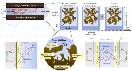 Based on the electroadsorption theory, the Helmholtz electrical double layer model is widely understood []. The initial CDI models for EDL structure models are the Helmholtz EDL model and the Gouy–Chapman–Stern (GCS) EDL model. An advanced equilibrium EDL structure model named the modified Donnan (mD) model can account for the macropores’ confined nature in CDI electrodes []. In the mD model, micropores are seen to have a strongly overlapped double layer, so the classical Donnan notion of a uniform pore electrostatic potential can be used. In-depth research has found that a high ion adsorption capacity is closely related to the micropores rather than the mesopores [,]. Thus, porous carbon is an attractive material for the electrochemical adsorption of HMs. In these micropores, typically, the Debye length λD is of the order of, or larger than, the pore size. In micropores, when the R of the pores is smaller than the Debye length, an overlap of the electrical double layer is found. Hence, the electrical potential makes a distinct jump from a value on the surface outside the particles to another value in the micropores [,]. Then, the concentration of counterions is significantly higher than that on the outside surface. Thus, the micropores (<2 nm) are highly effective in achieving high ion adsorption.