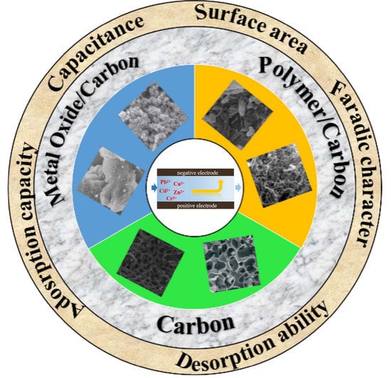 Great efforts to solve the challenges of CDI have been made. These include CDI configuration optimization and developments in operation style as well as the search for highly efficient and cheap electrode materials with high adsorption capacity and stability []. The electrode material is a crucial component of CDI cells that determines the desalination performance of CDI []. Usually, electrode materials should be conducive to a high surface area and have a good affinity with heavy metal ions. A large number of electrode materials have been developed for CDI. Figure 3 summarizes the materials applied for CDI, the majority of which include carbon materials, metal oxides, polymers, and their composites.