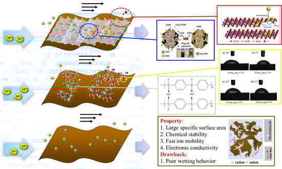 Aside from carbon-based materials, polymer-based materials have attracted great interest owing to their ion-exchanging ability and conductivity. Polypyrrole is one of the most studied polymers due to its high specific capacitance, high conductivity, and simple preparation. Polyaniline/attapulgite composites (PANI/ATP) were prepared via in situ oxidative polymerization []. The calculated equilibrium adsorption capacity was 15.42 mg g−1. The facile modified paper electrode with polymer attached to the surface of ATP contributed to the high removal efficiency of lead ions (66.5%) in wastewater, with an initial concentration of 2.5 mM Pb2+ and stable cyclability after 10 runs (64.2%). Li et al. deposited polypyrrole on chitosan, a stable adhesive agent functionalized with -OH and -NH2 groups, and proved that a polypyrrole/chitosan composite (Py/CS) exhibits considerably stable electroadsorption and desorption behavior and shows good performance regarding the removal of heavy metal ions including Ag+, Cu2+, Pb2+, and Cd2+ []. Transition metal sulfide has been viewed as a promising modified candidate for CDI. Hu et al. decorated ZnS and FeS on a carbon felt electrode. The ZnS on the carbon material increased the wettability and electrochemical capacitance. The enhanced adsorption ability of Cu2+ and removal capacity of Cu2+ was 27.4 mg g−1 in the presence of Cr6+ and natural organic matter [].