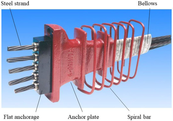 With the rapid development of national high-speed railways and expressway projects, prestressed structures have been increasingly widely used. Various new high-strength prestressed members have been designed, and various new anchorages are being widely used, among which the most important application is for various new bridges. The new 2000 MPa parallel steel wire stay cable used for the Hutong Yangtze River Bridge was specifically designed with a supporting anchorage in the research and development stage, and the stress and deformation in the anchorage were analyzed using the finite element method, the results of which verified that the strength and stiffness of the anchorage met the requirements [1]. Similarly, in the research and development of a 1960 MPa main cable steel wire and cable strand for the Humen Second Bridge, the corresponding anchorage was specifically designed, the design drawing was created, and finite element analysis was performed for verification [2]. In the construction of the Wuhan Qingshan Yangtze River Bridge, the anchorage with a 1860 MPa stay cable was specifically designed, and 42CrMo as selected as the anchorage material. The anchorage size was studied and checked using finite element analysis [3]. During the construction of the Third Yangtze River Bridge in Wuhu, a DM upsetting anchorage was used to stretch the steel wire, and a series of measurements were recorded to avoid quality problems such as fractures caused by eccentric stress at the pier head [4]. In the construction of the Wuhe Dinghuai Huaihe River Bridge, rotary cables in the same direction were adopted, a special anchorage system was designed, and specific construction technology was studied [5].
