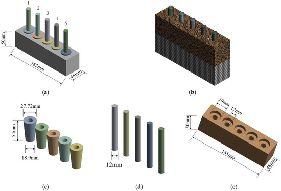 The model dimensions were as follows: the outer contour size of the flat anchorage was 185 mm (length) × 48 mm (width) × 50 mm (height), the diameter of the bottom hole was 18 mm, the diameter of the top taper hole was 27 mm, the taper of the hole was 14°, the center distance between holes was 34 mm, and the edge of the side hole was 24.5 mm away from the short side of anchorage and 10.5 mm away from the long sides of both sides. The diameter of the steel strand was 12 mm, the height of the clip was 54 mm, the diameter of the bottom was 18.9 mm, and that of the top is 27.72 mm. The length and width of the limit plate were the same as that of the flat anchorage, with a height of 50 mm; the bottom cylindrical hole had a diameter of 12 mm, and the upper cylindrical hole had a diameter of 29 mm and a depth of 8 mm.
