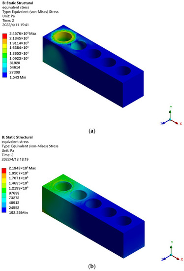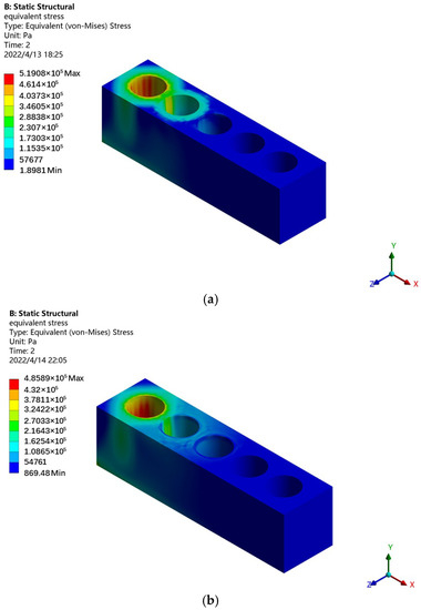 After the first hole stretches, the second hole stretches, and many different stretching schemes may arise. Figure 7 shows the stress distribution results of the second hole of the flat anchorage stretching after the first hole stretched. Similarly, with the limit plate, the stress concentration of the flat anchorage stretched on the second hole was substantially alleviated, and the extreme stress value dropped from 519.08 kPa to 485.89 kPa, representing a decrease of 6.4%. Different combinations of tension holes and their corresponding stress extreme results are detailed in Table 3. The above results correspond to tension holes 1 and 2 in Table 3, which means that hole 1 tensioned first, followed by hole 2. The table shows that, overall, the drop in the stress extreme value when the second hole was tensioned was not as large as that when the first hole was tensioned, and the maximum stress results for the different schemes differed little. Relatively, the drop in the extreme stress value was larger when the third hole was tensioned in the first two steps. We calculated the standard deviation of the stress extreme value of the conventional flat anchorage as 5.09 kPa and that of the new flat anchorage system as 7.20 kPa. The influence of the limit plate on the tension results of the different double holes was weak.