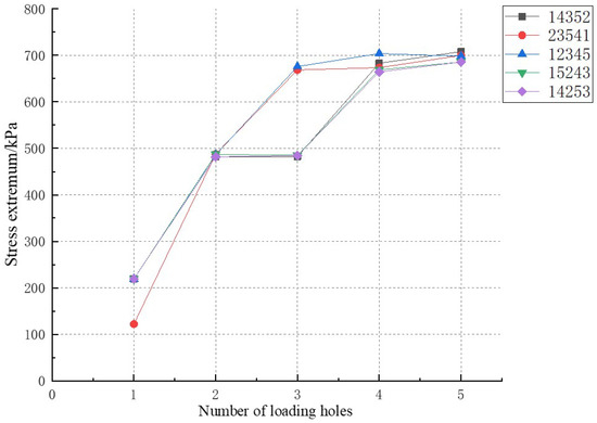 Figure 11 further shows the development curves of the extreme stress values of several tensioning sequences, with the corresponding numbers in the curves denoting the tensioning sequences. For example, “14253” denotes the sequential tensioning of the steel strands of holes 1, 4, 2, 5, and 3. As shown in the figure, different tensioning sequences showed gentle stress development; however, the periods of gentle change slightly differed. Regardless of the curve, the final values did not widely differ. Throughout the process, the stress extremes of the two schemes of the final tensioning of hole 3 were small, with a final stress extreme of 685.55 kPa, representing a 22.42 kPa difference from the scheme with the largest stress extremes. The stress curves were located below those of the other schemes, indicating the preferred tensioning sequence, as mentioned in the aforementioned data analysis.