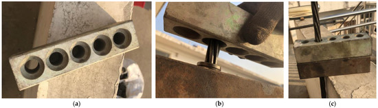 On the basis of previous design and research, a batch of flat anchorage limit plates were manufactured using 45# steel, as shown in Figure 12a. For the dimensions, we referred to the flat anchorage design; the dimensions were basically consistent with those mentioned in the numerical simulation. As shown in Figure 12b, the extended clip was placed in the second limit hole of the limit plate, and the steel strand passed through the first limit hole, finally forming the shape shown in Figure 12c. As such, the limit plate adequately protected the flat anchorage, the top surface was a plane, no clips were protruding, the hole spacing increased, and the jack tension construction was convenient.
