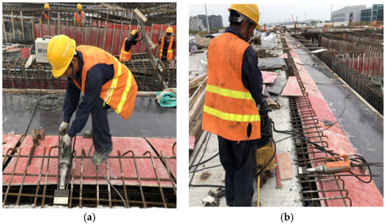 The device was used in the construction of narrow areas of the Huainan Huaishang Huaihe River Highway Bridge and Chizhou Yangtze River Bridge. The use position is as described in Section 2.1, mainly as the upper plate structure of the bridge box girder. Figure 13a,b show the construction site where workers used the new flat anchorage limit plate for tensioning, and the member next to the jack in the figure is the limit plate. After the application of the newly designed limit plate, no safety problems occurred at the construction site, such as sliding wires or squeezing deformation of clip by jack, and the construction efficiency was increased, which verified the feasibility of the design. Because of the low cost of the limit plate, this technology is convenient for popular use.