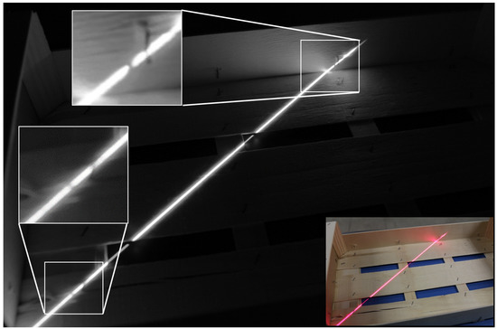 Several types of illumination and camera locations were tried, such as direct, indirect, lateral, and structured illumination, to decide which reinforces the features of a bad stapled nail in the image and which remains over thousands of images. The aim is to obtain a histogram where pixels representing the set of nails’ luminosities are separated from the remaining pixels in the image. Figure 2 shows the image using structured lighting projecting a straight line. In this case, pixels that belong to the straight line have a different illumination than the remaining pixels. With this type of illumination, a projected straight line should remain if no breaks occur in the crate surface.