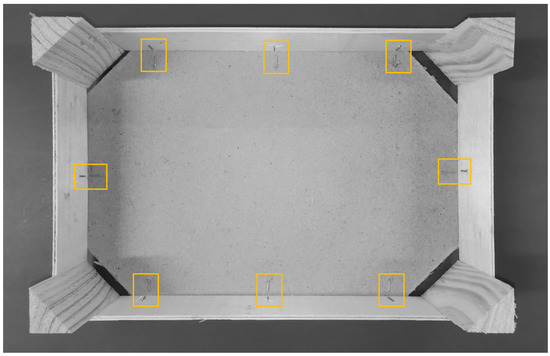 The configuration proposed in Figure 3 is used to acquire images to detect badly stapled nails in wooden crates using ANN. Figure 3 shows the submitted image to classify nails where the camera is located in a zenithal point of view over the crate. The crate is illuminated with indirect lighting to avoid shadows and brightness as much as possible. The yellow boxes represent the ROIs in the image that are analyzed with the algorithm that does not search nails in the image and just classifies nail ROIs as well or badly stapled. Once the ROI is captured, it is rotated to always have the floor of the crate on the right side if necessary. Depending on where the nail is in the crate, its corresponding ROI is rotated 90, 180, or 270 degrees. This operation will help the classifier to reduce the cases of well or badly stapled nails. In case the classification algorithm searches for well or badly stapled nails in the image, ROIs with nails are not defined. Figure 4 shows a set of six nails labeled as well stapled (a) and badly stapled (b), where the ROI is always orientated in the same way. The crate’s floor is on the right side of the ROI in all cases, with the independence of its location in the crate. These nail patterns are used to train the classification algorithm with a predefined ROI. Figure 4c,d shows the labeled well and badly stapled nails, where nail orientation depends on its location in the crate. As before, these patterns are used to train the algorithm that does not need predefined ROIs and detects the nails’ location in the image.
