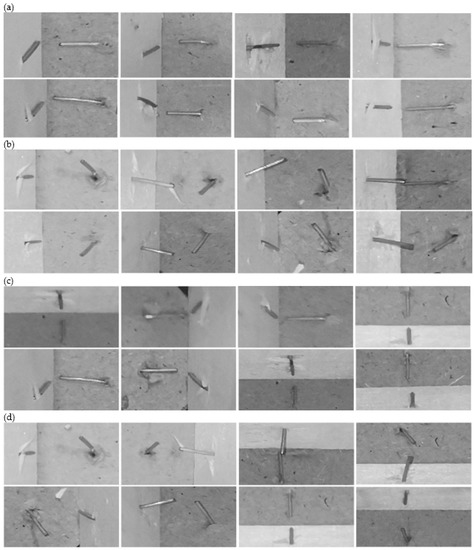 Labeled stapled nails. (a,b) Good/bad stapling with all ROIs oriented in the same way. The crate’s floor is on the right side of the ROI in all cases, with the independence of its location in the crate. This helps the algorithm to classify nails, but the user has to define nail location in the crate before. (c,d) Good/bad stapling with ROIs defined as it appears in the image. These patterns are used in the training process of the algorithm that searches for well or badly stapled nails in all of the image.