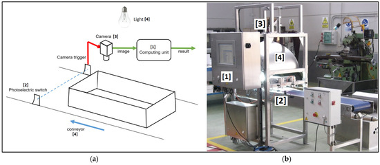 Figure 5a shows a schematic of the built computer vision system’s main parts that work as follows. The in-line sensor detects the presence of a stitched crate in the conveyor. It triggers the camera to capture the image analyzed by the computer unit. Since the camera is triggered by the presence of the stitched crate in the conveyor, the crate is always located identically in all of the images. Consequently, this feature allows for defining the areas in the image where nails are present, and the algorithm just classifies them. In this case, the yellow boxes in Figure 3 represent these ROIs. This definition shortens the algorithm execution time since the algorithm should decide if the nail of the ROI is well or badly stapled only. On the contrary, the user should define the nail location for each different model of the previously manufactured stitched crate in the system. If ROIs with nail presence are not defined previously, the algorithm must decide where the nails are in the image and whether they are badly stapled. Depending on the desired human intervention in the definition of the quality control process of the stitched crate and the time available to conduct the inspection, both solutions are possible. When the image is processed, the classification result is sent to the conveyor control unit to manipulate the stitched crate conveniently, and the captured image and the classification result are sent to a database to be analyzed, if necessary, by the production manager, quality control manager, or to resolve customer complaints if they exist.