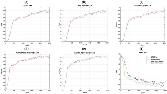 After each epoch, the classifier is run with the validation data to compute the total loss and mean Average Precision (mAP) to evaluate the classification performance. Results are shown in Figure 6a–e. Figure 6a–e presents the evolution of the confidence of the classification task on the validation set when the number of network training steps with the training set increases. With all models, the first 500 steps reduce the confidence of the classification by 60%. Afterward, the loss reduction ratio per step is reduced, and the optimization needs 2000 steps more to arrive at 95%. This is because model weights are adjusted at the beginning to classify different images. Consequently, small changes in the neural network weights improve the classification ratio significantly. The network improves its classification abilities with the training until the classification on the validation dataset does not improve further.
