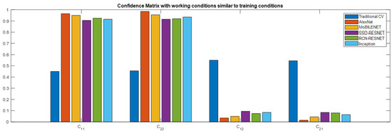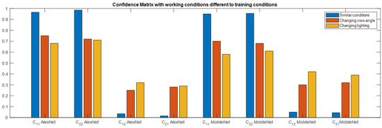 To compare the results of Alexnet and MobileNet models in a graph when image acquisition conditions change, Figure 9 shows a bar graph of the confidence matrix elements. Best performance is computed when the angle of view and lighting conditions are similar to the training step.
